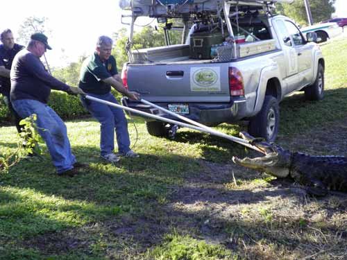 “Routinely we here in south Florida get calls for “nuisance alligators” in residential areas. Sometimes these gators are quite large. When they are big, we call Florida Fish and Game (FWC) who sends a trapper to get the gator before we have to shoot it. The trapper shoots it in the tail with a bow line then reels the gator back into a noose. Once in the noose, the gator is pulled a shore for transport. This one gator in particular was so large the two trappers required help to pull it a shore. It took 2 trappers and 3 deputies to actually lift the gator into the rear of the truck.”