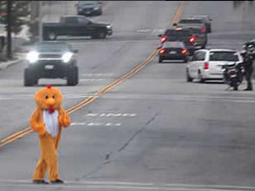 LAKE ELSINORE, Calif. — A member of the Lake Elsinore Police Department dressed up as a chicken Thursday as part of a law enforcement crackdown aimed at drivers who don’t yield to pedestrians in crosswalks.