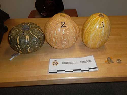 A spokesman for the agency said the pumpkins seemed to be a little too heavy, so they were sent through an X-ray scanner. The Mounties were called in once the bags were discovered.