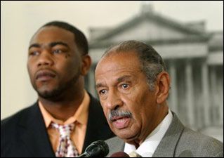 ![]() House Judiciary Committee Chairman Rep. John Conyers, D-Mich., right, accompanied by Alex White, a police informant, meets reporters on Capitol Hill in Washington, May 3, 2007, to discuss the death of Kathryn Johnston, an elderly Atlanta woman who died during a police raid. (AP Photo/Dennis Cook) |