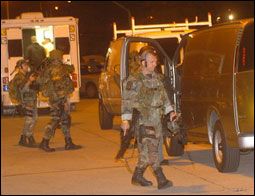 ![]() Members of the Pennsylvania State Police tactical team prepare to leave a command post set up in a rest stop along Interstate 80 near Scotrun, Pa., early Thursday morning. They were heading up the road to do a night time search of a wooded median where they are looking for a suspect in the shooting of two NYPD police officers. (AP Photo) |