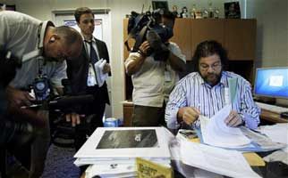 ![]() With television cameras over his shoulder, Mike Jimenez, president of the California Correctional Peace Officers Association, looks over a petition to recall Gov. Arnold Schwarzenegger, at the CCPOA headquarters in West Sacramento, Calif. (AP Photo/Rich Pedroncelli) |