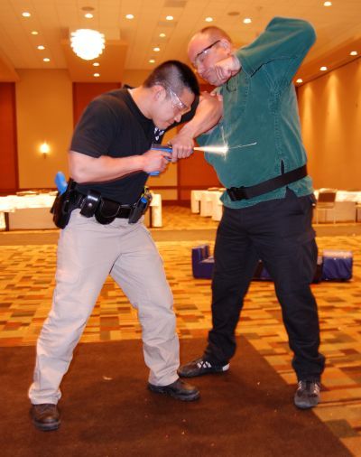 Here’s a picture from last weeks 2008 ILEETA Conference in Chicago, IL. Officer Justin Song (left) of Ankeny (IA) PD firing simunition Securi Blanks at Arrestling Instructor Deputy Rob Bardsley, King County Sheriff’s (WA) Office.