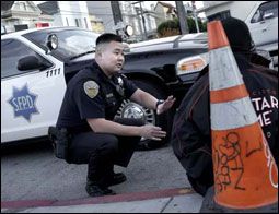 ![]() Officer Jamie Hyun, after making a traffic stop, explains to a young driver why he is being cited. Hyun works out of the Mission Station. Chronicle photo by Brant Ward |