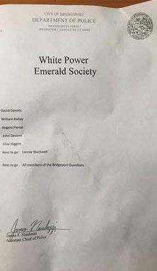 The letter, a list of a half dozen names under the heading “White Power Emerald Society,” is written on department letterhead bearing the name of Police Chief Joseph Gaudett Jr. and containing the alleged signature of Assistant Chief James Nardozzi.