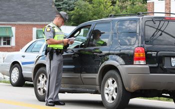 ![]() Trooper Chris Masters, KSP Post 12, checking registration and insurance of motorist. (Picture courtesy of Kentucky State Police Dept.) |
