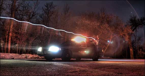 This photo was taken with a Nikon D5000. The 10-second exposure was made into a single image HDR with Photomatix. It depicts Sergeant Tad Pritchett doing a little night training with the X26 TASER in hand.