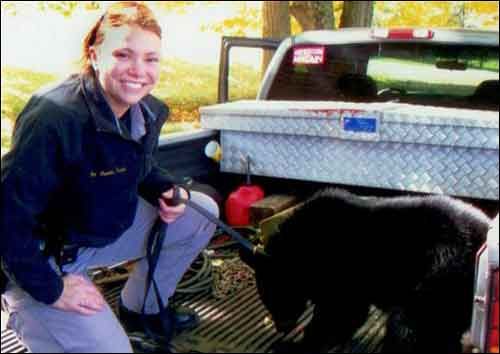 In a photo provided by the Unicoi County Sheriff’s Department, Sgt. Heather Rheams holds on to a bear bear she helped transport to Johnny Lynch’s wildlife sanctuary in Unicoi. The bear had been struck by a vehicle on Interstate 26 between the Flag Pond exit and the North Carolina border, bleeding at the mouth and suffered a concussion. (AP Photo/Unicoi County Sheriff’s Department).