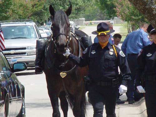 Officer Richard Hubbard currently works the Mounted Patrol Division for the Austin (Texas) Police Department. In this photo he is with Drago, a percheron mix. Hubbard writes, “This is the ‘Riderless Horse’ during the funeral services for Officer Leonard Reed of Cedar Park, Texas who had passed away Aug 18,2010. The services were held Aug 25,2010. I was very honored to represent the department and the be a part of the ceremony itself.”