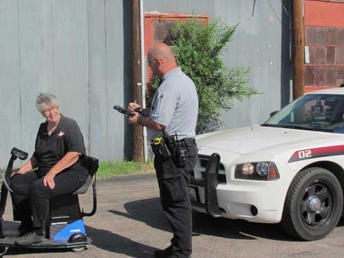 This week’s photo comes from Sgt. Traven Berrie with the Colorado City, Texas Police. Berrie was returning a Wal-Mart scooter that managed to wander 40 miles from it’s store, when he asked dispatcher Jo Yancey to hop on for this great photo op. Berrie writes, "...so I could write a citation for ‘speeding’ which would have been impossible, since we clocked its top speed at 1.2 mph, downhill.”