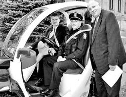 Mayor Paul A. Dyster joins Patrolman Jeff Grzeskowiak in one of the electric cars presented to the City of Niagara Falls by Richard M. Kessel, right, president of the state Power Authority. (Image courtesy of Bill Michelmore, Buffalo News and the New York Power Authority) |