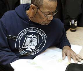 ![]() Dorie Clark studies for an upcoming first responder test during his law enforcement training class in Columbia, Mo. At age 65, Clark is learning a new career after being laid off from an Eldon, Mo. manufacturing plant. (AP Photo) |