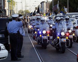 A procession carries the body of Philadelphia Police Officer Patrick McDonald, who was fatally shot while pursuing an armed suspect yesterday. Another officer was wounded and the suspect was killed. (AP Photo) |