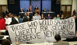| Attny. Gen. Alberto Gonzalez explains why warrantless surveillance is critical to preventing terrorist attacks while protestors voice their opposition. |
