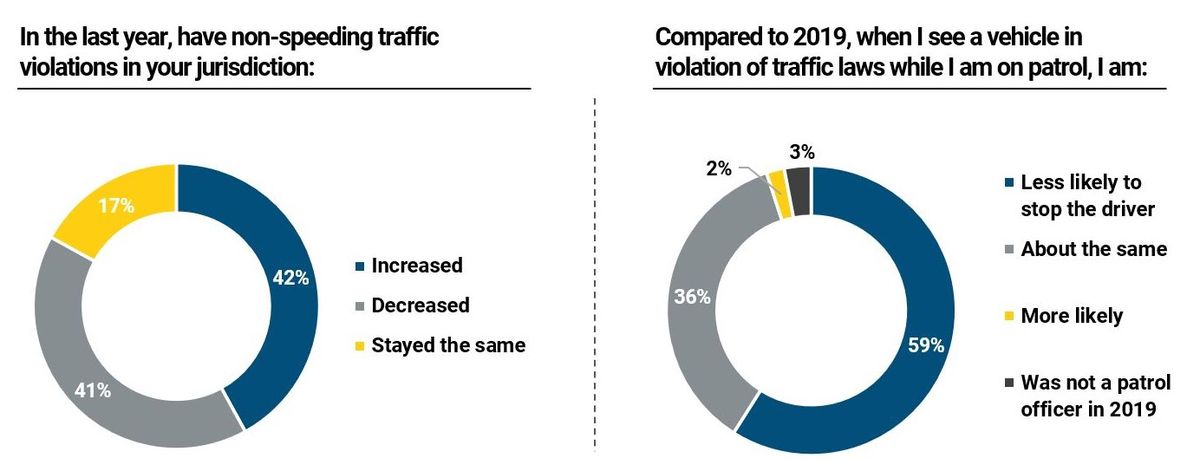 We wanted to know if officers had changed their behavior regarding traffic stops since 2019 and nearly two-thirds (59%) of those who responded said they were less likely to stop a vehicle in violation of traffic laws while on patrol than two years ago, while a third (36%) said there was no change. Only 2% were more likely to stop a vehicle.