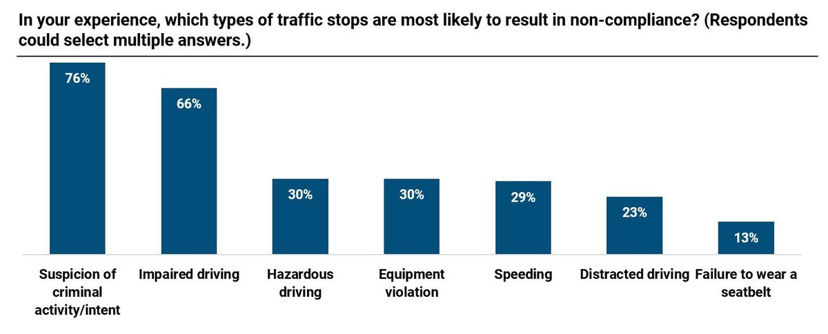 We asked respondents to select the types of traffic stops most likely to result in non-compliance. Suspicion of criminal intent and impaired driving were selected most often, with 76% and 66% of respondents selecting one or both. Just over a third of respondents said hazardous driving, equipment violations and speeding were likely to result in non-compliance. Just over one in five respondents selected distracted driving and just over 10% selected failure to wear a seatbelt.