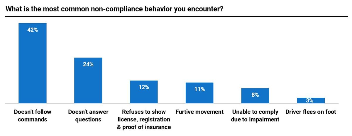 The most common non-compliance behavior encountered was a failure to follow commands (42%) followed by a failure to answer questions (24%). Around 10% of respondents said refusal to show a driver’s license and other documents or furtive movements.